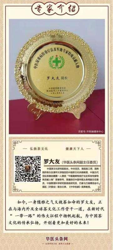 这是社会大众对中国茶文化研究院院长、高级政工师罗大友多年来殚精竭虑、呕心沥血研究、传播、弘扬博大精深的中国五千年茶文化工作而获得的学术研究成果及所取得的工作业绩的最好诠释。最近、中国茶文化研究院院长罗大友又被中国医药教育协会评为“中医疑难病特效疗法军地专家特殊贡献人物”而受到奖励。