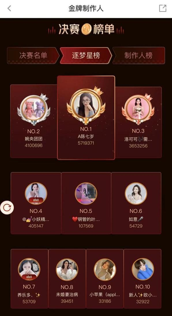 在《金牌制作人》的赛程中,陈七岁成为了一匹黑马,名不见经传的她突然得到匿名用户“骑士神秘人”的支持,一跃爬到积分榜单前列,从默默无闻到全站榜单第一,陈七岁仅用10天时间便成为平台上最瞩目的新星主播,上演了一场灰姑娘式的逆袭。这在传统的直播模式中是无法想象的。