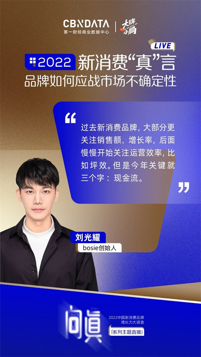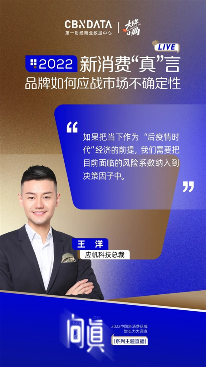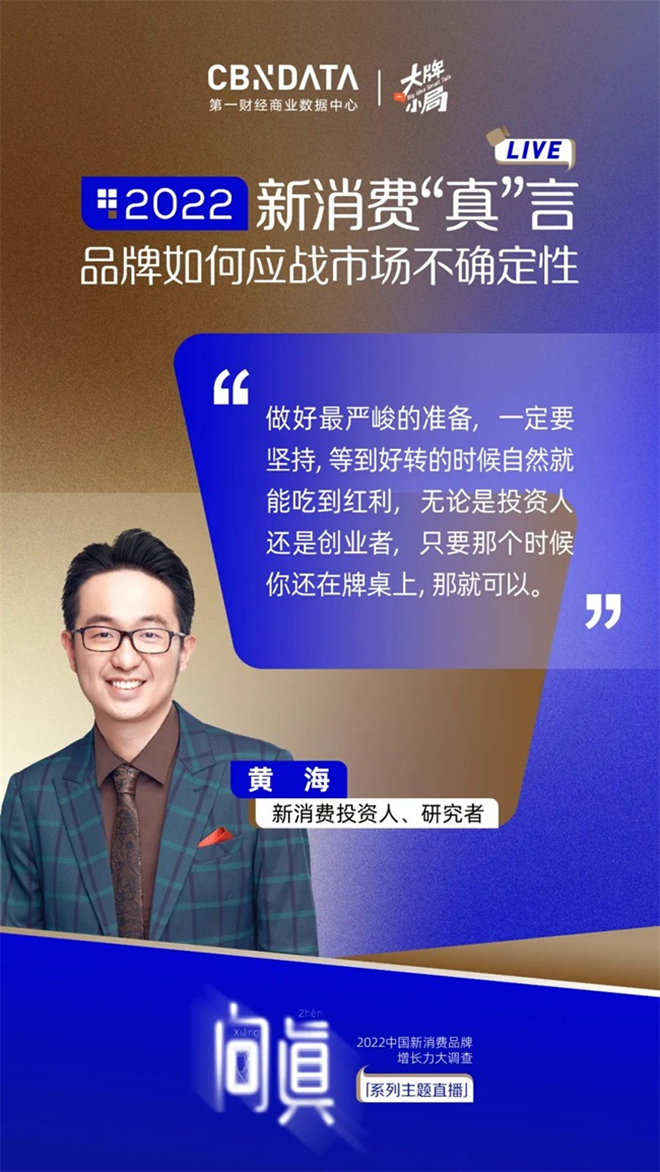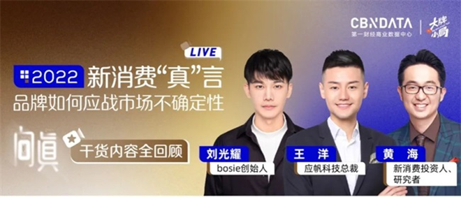 在此背景下,CBNData(第一财经商业数据中心)发起「向真」系列主题直播。首期直播对谈「2022新消费“真”言,品牌如何应战市场不确定性」重磅邀请到新消费投资人&研究者黄海、bosie创始人刘光耀与应帆科技总裁王洋,从用户、需求、供给、营销、管理等多方面入手,一起聊聊新消费品牌面临“真挑战”下的应变与不变。