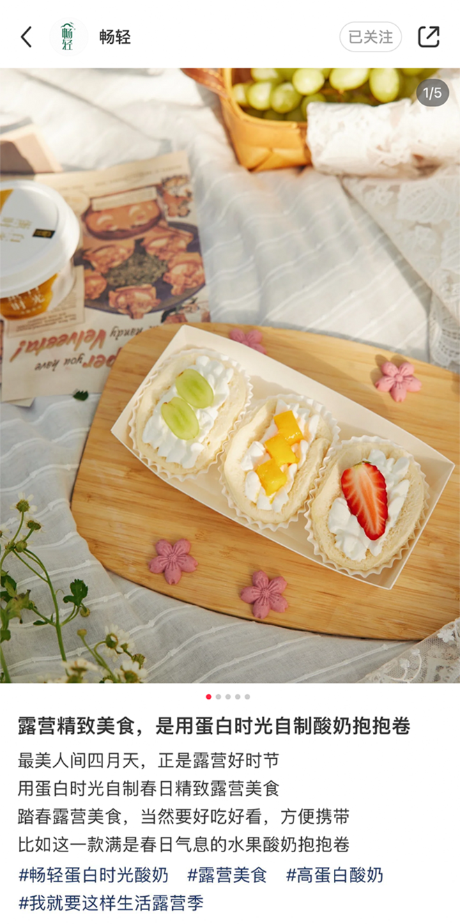 关于如何开启美妙的春日露营,畅轻蛋白时光酸奶也在自己的小红书笔记中给出答案:用高蛋白0蔗糖的健康酸奶,自制一份简单美味的露营下午茶“酸奶抱抱卷”。通过畅轻蛋白时光酸奶的DIY二创,露营场景的多元化联动,年轻人对于品质生活的理想状态更加具象化,而品牌小红书的笔记下亦有评论表示“酸奶下午茶很诱人,适合春天”,这也足见网友在品牌的带动下,对各样生活方式所产生的美好向往。