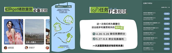 与此同时,小红书站内也开启了《我就要这样生活》露营季的H5互动活动,进入主页后,一大波明星、KOL的攻略分享,首先就能帮助用户唤起对露营的向往,而官方的划重点则进一步帮助了解露营注意事项。随后,打卡任务攒积分换福利的互动玩法,不仅能让用户跟随多样的笔记分享收获相关知识,来自畅轻蛋白时光酸奶的产品和体验福利,也刺激参与者亲身走出室内,带着畅轻蛋白时光酸奶一起享受春日露营的乐趣。