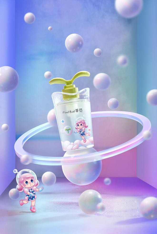 除了拥有中检科背书的全绿配方,以及提出女性保养理念,「芽觅」的另一特色在于包装的年轻化设计。联创月月为品牌手绘了可爱的小Yami形象,产品采用潮酷太空舱瓶型设计,按压头为卡通绿芽,整体视觉符合品牌的潮趣定位。