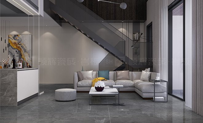 顺辉瓷砖·岩板莱茵灰纹理简单但富有设计感,大面积铺贴远看具有利落的时尚感,近看处处透露着家居生活的精致。