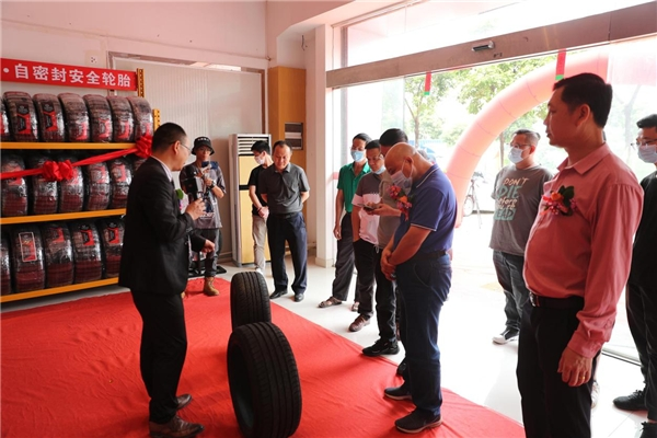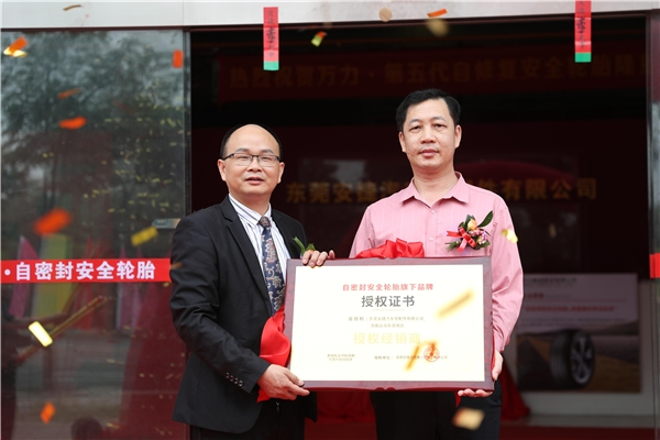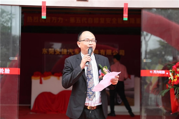 在开业仪式上,万力·自密封安全轮胎东莞运营中心单旭昌董事长表达了对到场嘉宾们的感谢,并接受了自密封安全轮胎品牌授权书。