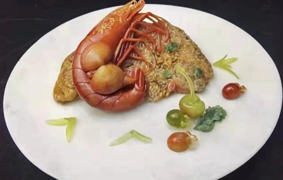 作为毗邻海洋的国家,葡萄牙的海鲜饭在世界上享有盛名,用瓦煲或是铝锅焖煮出的米饭搭配各类海鲜,洋溢着无限的海洋气息。利用美玉雕琢出的海鲜饭,龙虾栩栩如生、米饭颗颗饱满晶莹,似乎冒着热气,给人以极度的感官刺激,令人啧啧称奇。