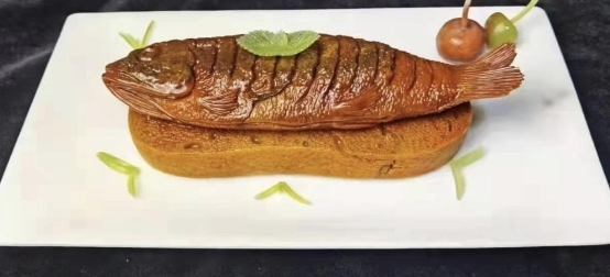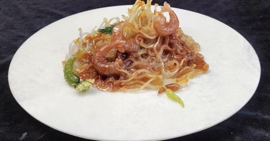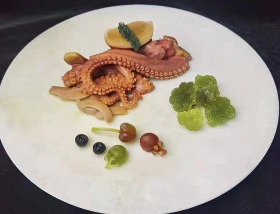 西班牙海鲜面以圆细的意面取代米饭,浸润在鲜香扑鼻的鱼汤中,佐以生猛海鲜,让面条更具风味的同时,也带来浓烈的海洋气息。利用玉石雕琢而成的面条晶莹剔透、水润光泽,既闪耀着玉石的光芒,也有粘稠浓郁的汤感,让观赏者食指大动。