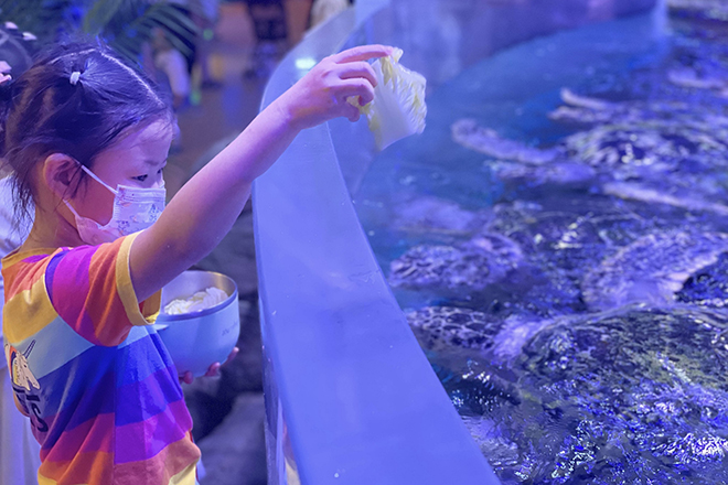 图:武汉海昌极地海洋公园“海龟探险营”海龟喂食