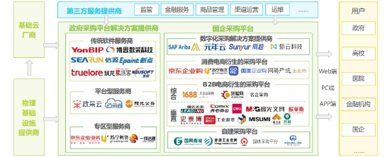 目前,从政府端来看,电商化阶段开始通过自有技术部门及第三方辅助搭建电子卖场和电子招投标系统。平台化阶段出现区域一体化的政府采购平台,整合下属各县市的交易和监管,供应商无需多次重复入围和签订协议,实现商品信息标准化。从国企端来看,为国企采购平台搭建提供技术支持的第三方服务商主要有三类:数字化采购解决方案提供商、消费电商衍生采购平台和B2B电商衍生的采购平台。国企根据自身规模和经营属性,对采购平台服务商的偏好也各有不同。政采云是同时服务政府采购和国企采购的典型企业之一。