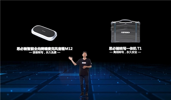 “转写一体机T1拥有便携式笔记本的外观设计,内置i7处理器、64GB内存,将实时语音识别引擎、录音文件识别引擎、声纹识别引擎全部集成起来,不需要连接网络,2分钟内完成部署,可实时速记转写,更加安全可靠。”现场介绍道。