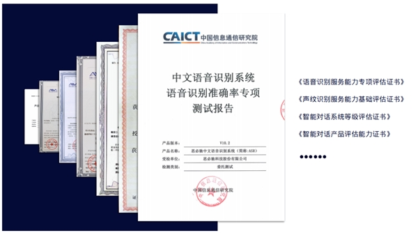 思必驰拥有全链路的智能对话核心技术,技术创新能力让思必驰的多项语音技术均获得行业认可,例如,思必驰中文语音识别系统、声纹识别服务、智能对话等多项技术均通过中国信通院认证,分别获得《语音识别服务能力专项评估证书》《声纹识别服务能力基础评估证书》《智能对话系统等级评估证书》《智能对话产品评估能力证书》等。