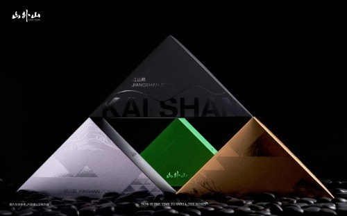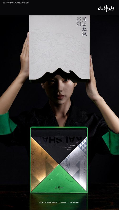 “开山之粽”以开山之作为谐音,寓意山外山,开新山、走新路的初衷,寄托传承、创新的新时代品牌理念。首先,从颜色设计和工艺上,礼盒以清山灰配青山绿,触感绵纸做山川压纹,辅以底部山形镂空设计,寥寥几笔的青山灰文,将宋韵山水画的美学精华浓缩在礼盒上,宋风之山跃然而现,让人近距离欣赏到风雅“宋”深处。除去表意的外观设计以外,礼盒的交互结构设计也是一大亮点。通过见山、开山、遇山、寻山、造山的几个维度概念巧妙解构了粽子礼盒的用户体验,与用户形成互动和思考,从而形成品牌记忆。打开包装后的四个不同颜色山形粽,金山粽,银山粽,江山粽,青山粽分别对应了不同的寓意。