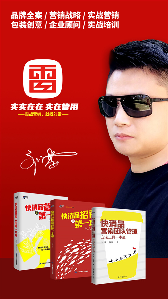 刘雷,是业内著名的新实战营销专家、新实战营销创始人,众多成长型企业的幕后战略指挥官,在国内营销界,刘雷可以称得上是新实战营销的领军人物。著有《快消品营销人的第一本书》《快消品招商的第一本书》《快消品营销团队管理方法工具一本通》等实战畅销书,被多家500强企业作为内部学习教材。