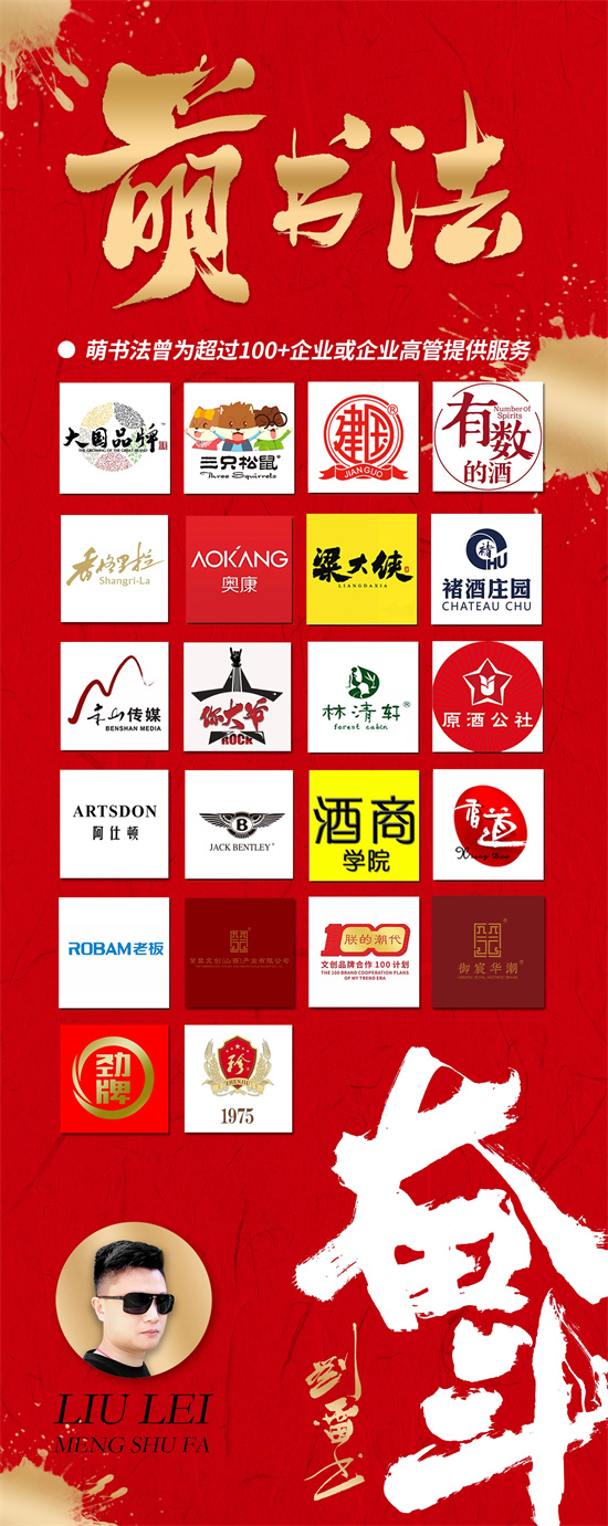 刘雷的萌书法曾为CCTV-1《大国品牌》、茅台集团、奥康集团、建国酒业、香格里拉酒业、三只松鼠、宾利红酒、粱大侠、林清轩、原酒公社、老板电器、劲牌、珍酒、香道食品、阿仕顿男装、故宫文化创意产业有限公司旗下子公司紫禁文创等超过100家企业的创始人、总经理或高管提供企业或私人书法订制,为众多中高端品牌的商业书法广告传播应用,多家企业国潮书法包装的推广和应用,刘雷作为顾问和指导老师。