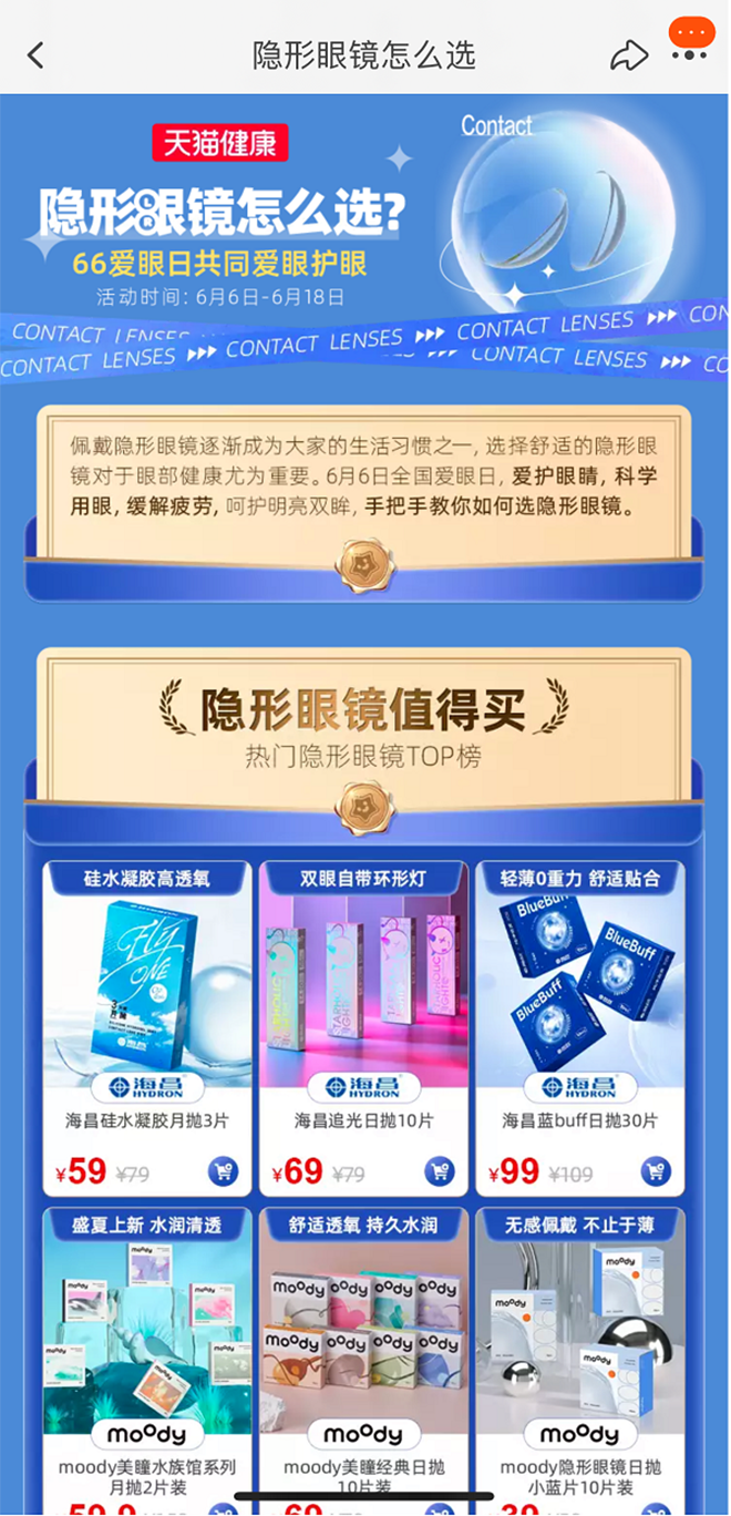 6月6日“全国爱眼日”,天猫健康上线了一站式隐形眼镜指南页面,以此助力商家复工复产,并为用户选购隐形眼镜提供科学专业的指导。用户在淘宝/天猫APP搜索“教你挑隐形”即可进入隐形眼镜专题页。