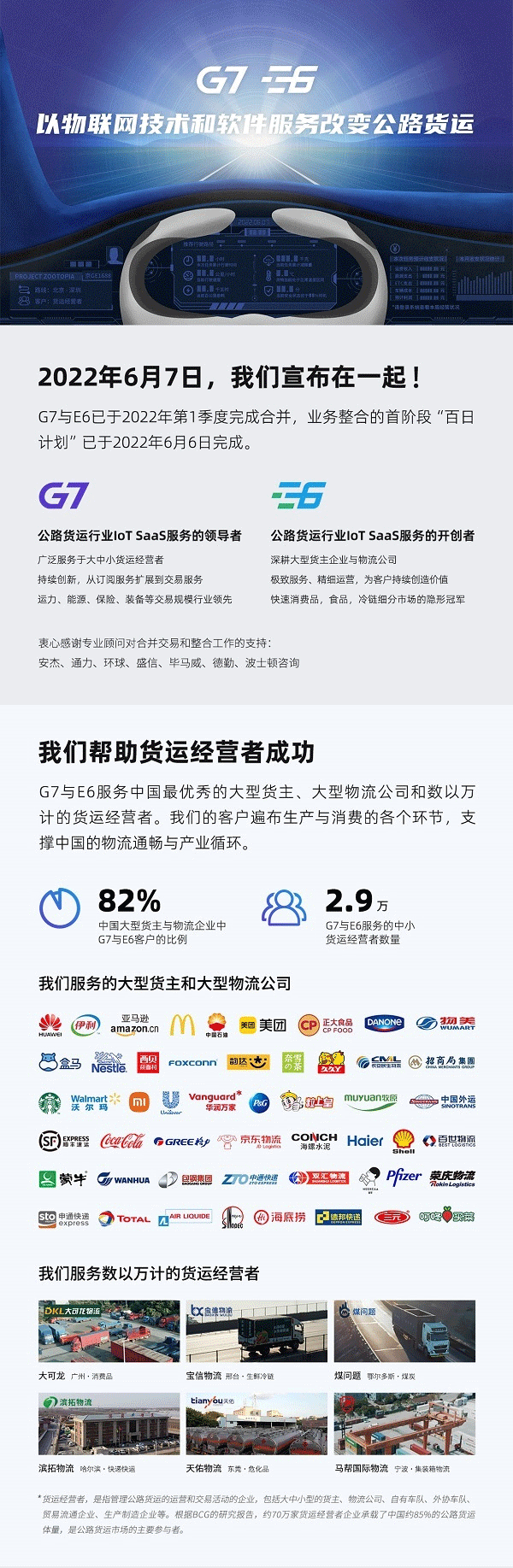 G7和E6是物联网技术与软件服务领域的代表企业。双方均以物联网技术和软件为核心,向大型货主、大型物流企业和数以万计的货运经营者提供服务。在本次合并前,G7和E6服务了行业中80%以上的大型货主和大型物流企业,服务了近3万家中小货运经营者,帮助他们提升效率、增加收入。