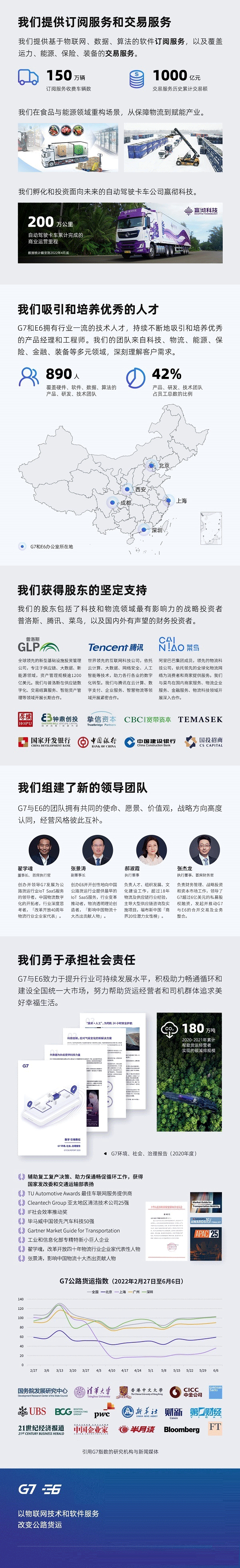 董事长兼首席执行官翟学魂:「公路货运行业的数字化进程刚刚开始,货运经营者无比期待用数字化产品改变经营方式,实现商业成功。G7和E6的合并使我们可以更坚定地投入技术,用数据驱动的产品为客户持续创造价值。」