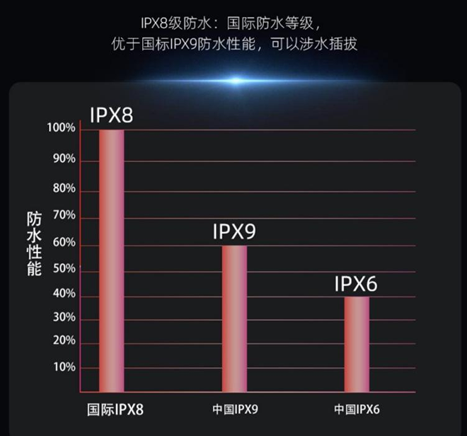 特别提醒大家一定要消除这个误区:IPX8是国际最高防水等级,防水性能远高于中国IPX9的防水性,IPX9只是中国防高温喷水的等级,千万不要被一些打着IPX9防水等级的插座误导了,只有IPX8级才能真正做到不怕水、不漏电。