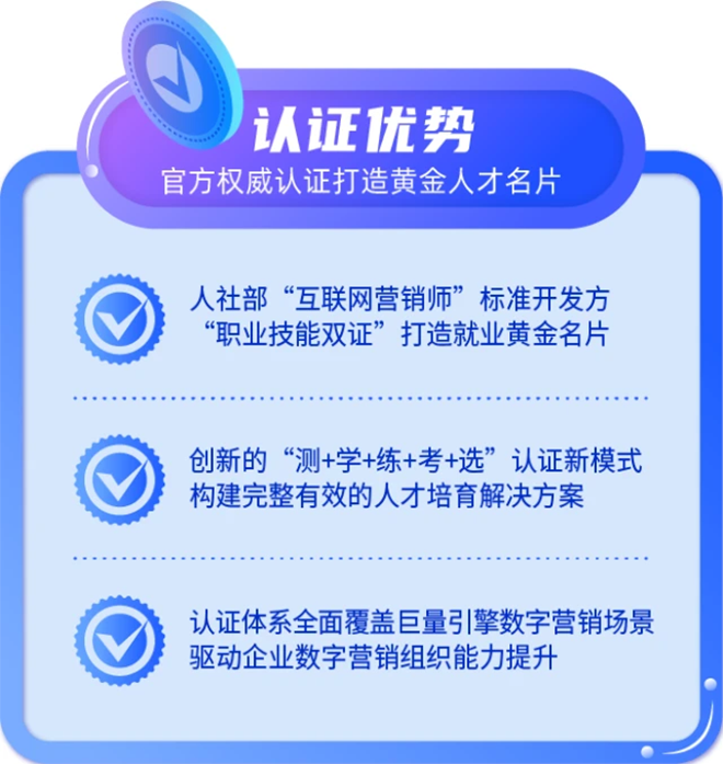 人社部门官方权威认定,“职业技能双认证”打造黄金人才名片本次升级的还有产品的权威性,巨量认证(OMC)部分科目与人社部门的「互联网营销师」实行“职业技能双认证”,在职业技能双认证的加持下,从业者在获得自我成长与职业进阶的同时,还将享受费用补贴等一系列人才惠民政策。官方权威背书与职业技能双认证将极大提升个人的就业竞争力。