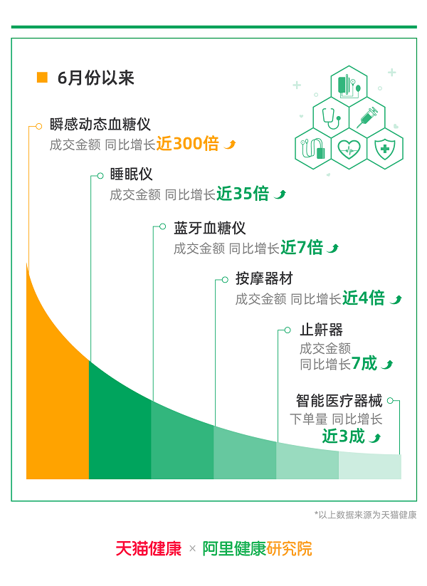 其中,6月份以来,天猫健康上的睡眠仪成交金额同比增长近35倍,止鼾器成交金额同比增长7成。