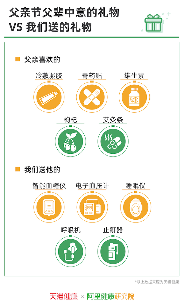 有趣的是,父亲节前夕,相较于子女们送来的科技含量较高的健康类商品,父亲们更倾向于为自己购买相对实惠、传统的健康类商品。数据显示,6月以来,50岁以上男人在天猫健康购买最多的健康类商品为冷敷凝胶、膏药贴、维生素、枸杞和艾灸条。